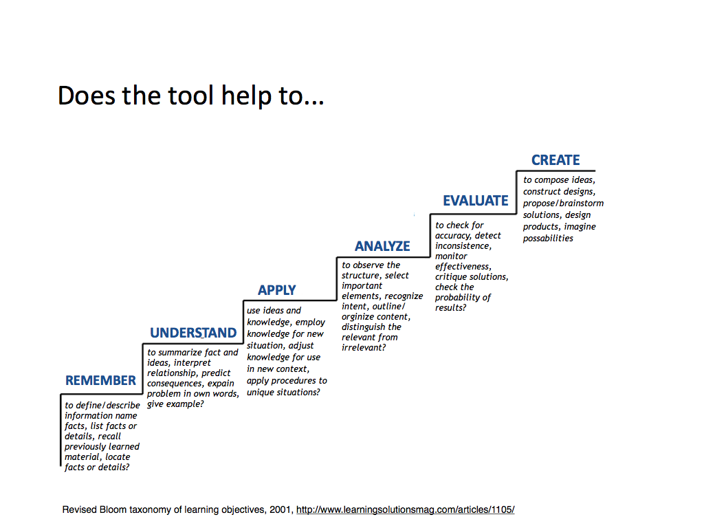 Think about one tool that you are familar with and examine it against Bloom’s taxonomy of learning activities and outcomes (figure below).